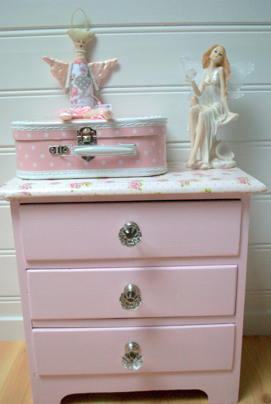 Så nydelig liten kommode, OG jente;-) Kjempeflott rosafarge du har brukt! Og det gjorde seg godt med voksduk på toppen!